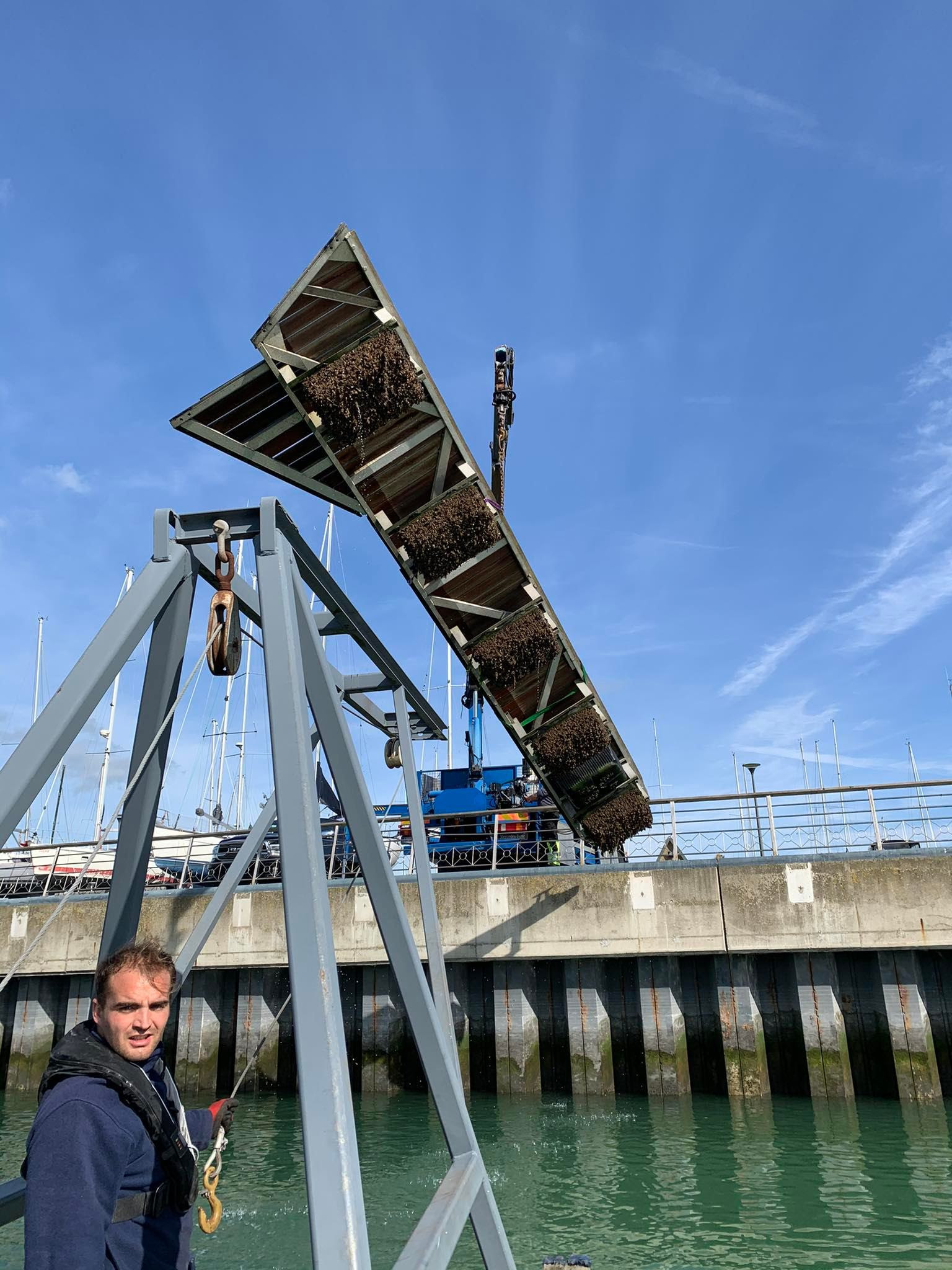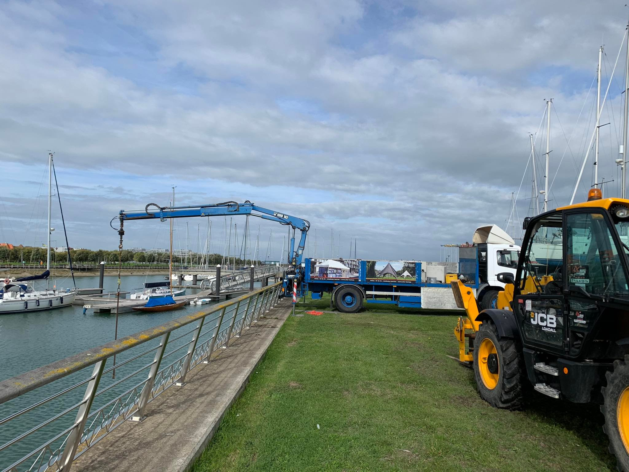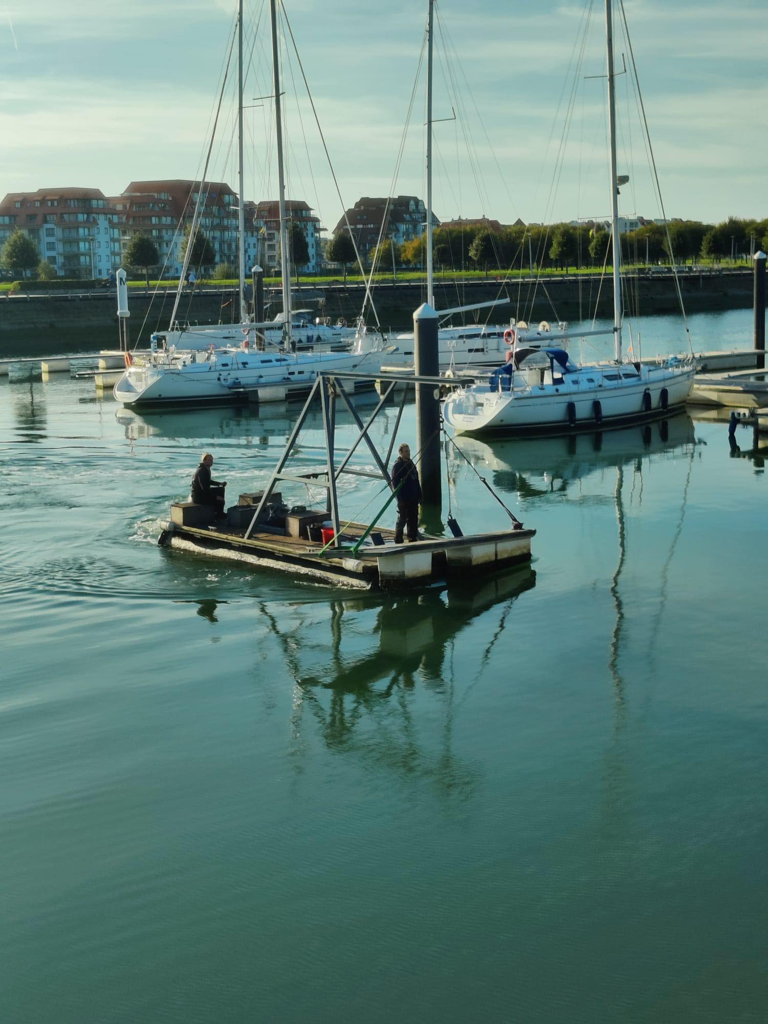 We zitten momenteel in de eerste fase van de werkzaamheden. De aannemer Herbosch-Kiere, onder leiding van de AMDK, is reeds begin oktober gestart met de bouw van de nieuwe landhoofden. Wij, met de KYCN, zijn momenteel volop bezig met de ontruiming van de haven. Alle nutsleidingen en toebehoren op de steigers zijn reeds verwijderd. Hiervoor konden we rekenen op een gemotiveerd team van vrijwilligers die de klus goed hebben doen vooruitgaan waardoor we ver voor op planning staan. Op vrijdag 07/10 zijn we gestart met de evacuatie van de catways die allemaal het water uit moeten. Hiervoor wordt een nieuw systeem toegepast waarvoor we het vlot van de WSKLuM mogen gebruiken, over helpende buren gesproken, dank u Max! De catways gaan allemaal het water uit ter hoogte van de bezoekerssteiger d.m.v. een kraanwagen. Hiervoor hebben we 2 delen van de bezoekerssteiger moeten wegnemen om meer ruimte te creëren, een spannende klus bij 4-5 bft. Erna brengen we deze naar de Kromme Hoek waar sommigen het einde van een carrière bereikt hebben en andere de werfzone (bij de blauwe containers) ingaan voor een grondige opfrissingsbeurt en nog enkele jaren dienst mogen doen.